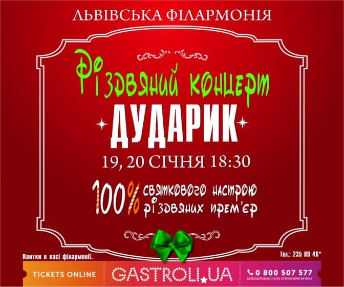 Початок концерту – о 18:30. Вартість квитків – від 100 до 300 грн. Придбати їх можна в касі філармонії (номер телефону – 032 235 89 46) та за посиланнями: 19 січня та 20 січня.