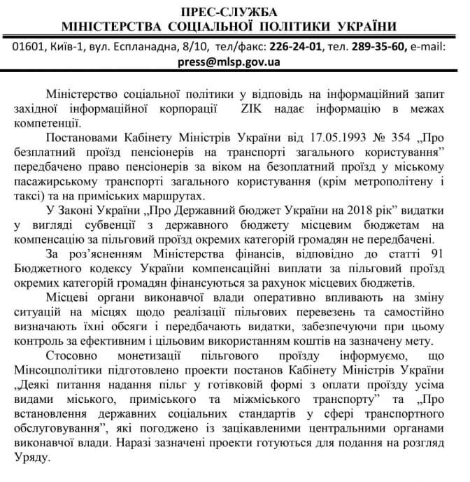 Водночас у міністерстві зазначають, що в держбюджеті на 2018 рік видатки у вигляді субвенції місцевим бюджетам на компенсацію за пільговий проїзд не передбачені, тож виплати за пільговий проїзд фінансуються за рахунок місцевих бюджетів.