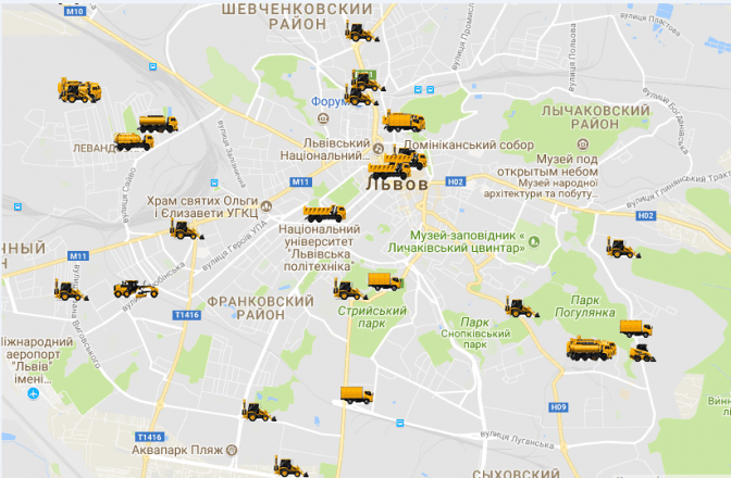 Станом на 9:45, згідно з GPS-картою відстежування снігоприбиральної техніки, у місті працює 40 машин. Концентрацію техніки зафіксовано в центрі міста, у Шевченківському Франківському та Залізничкому районах і у напрямку Винник.