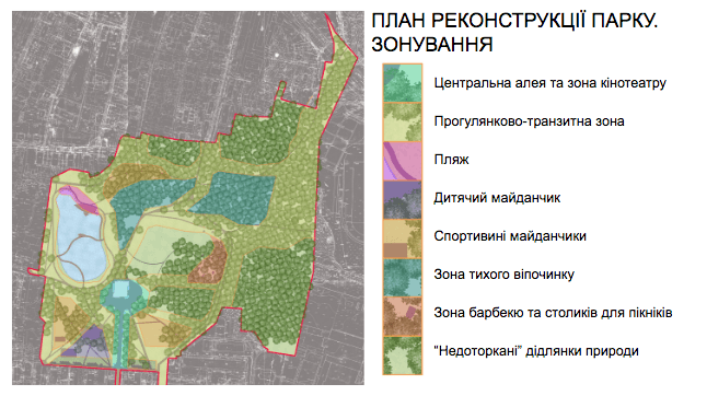 «Передбачили створення в парку активних та спокійних зон, адже багато людей казали, що використовують час в гаю як можливість побути на самоті. Усі казали, що потрібне освітлення, бо увечері в парку страшно ходити. Там безумовно потрібні лавки, бо ті, що там є, – у поганому стані, на реконструйованій алеї та біля кіноцентру взагалі лавок немає, а потреба в них є велика», – додала вона.
