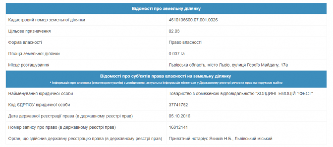 Згідно з кадастровою картою України, ділянка під шестиповерхівку, вказана в проектній документації, належить «Холдингу емоцій «!Фест».