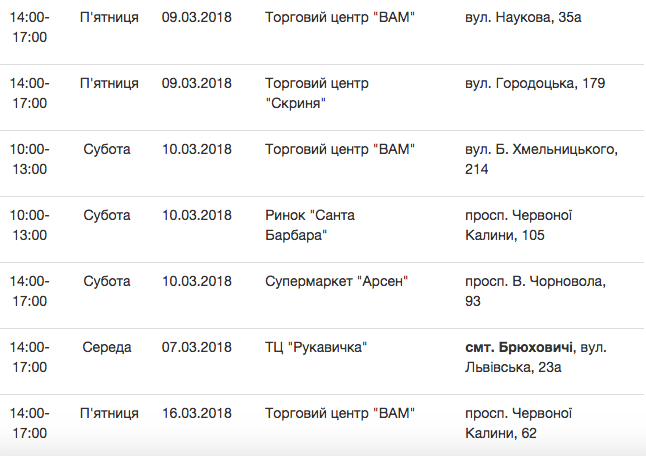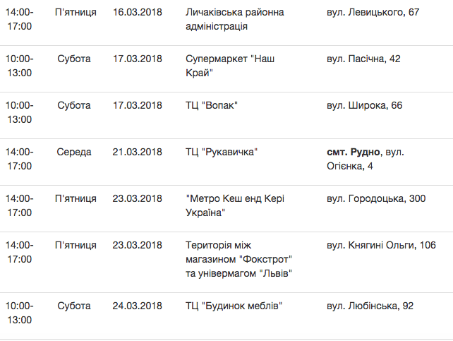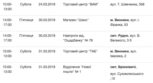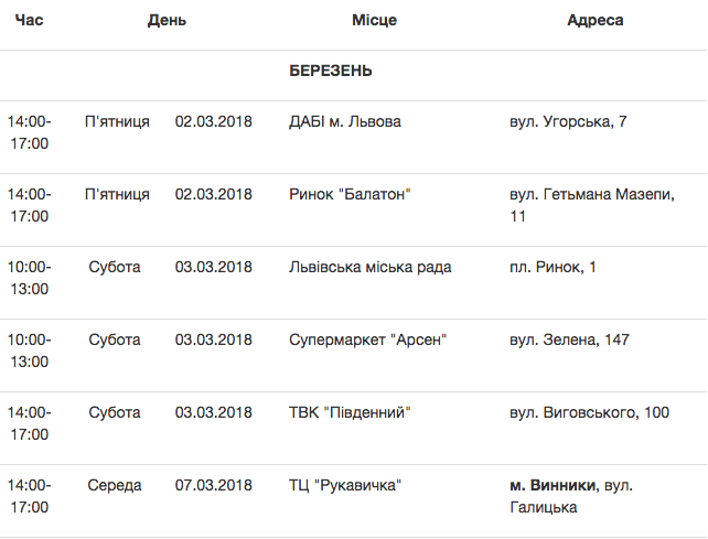 Графік стоянок Еко-буса у березні 2018 року