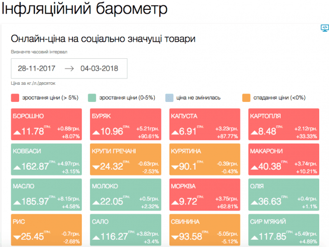 В Україні презентували «індекс вареника» – онлайн-сервіс, який показує динаміку цін на соціальні продукти та інфляцію. Онлайн-барометр та онлайн-калькулятор інфляції запустили на платформі PRO. Розробка належить Офісу ефективного регулювання BRDO. Про це повідомляє The Village Україна.
