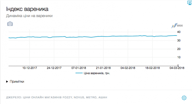 Згідно з «індексом вареника», протягом останніх 4 місяців вартість продуктів у магазинах зросла на 6,82%. Ресурс також пропонує інфляційний калькулятор, котрий дозволяє оцінити, як із часом змінювалися ціни в країні.