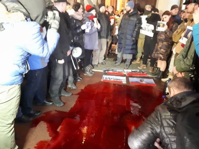 Представники організацій «Сокіл», «Добровольчого руху ОУН», «Спротив Романа Шухевича», «Дух нації» та інших розлили біля центрального входу в Оперу свинячу кров та кинули в неї дві троянди.