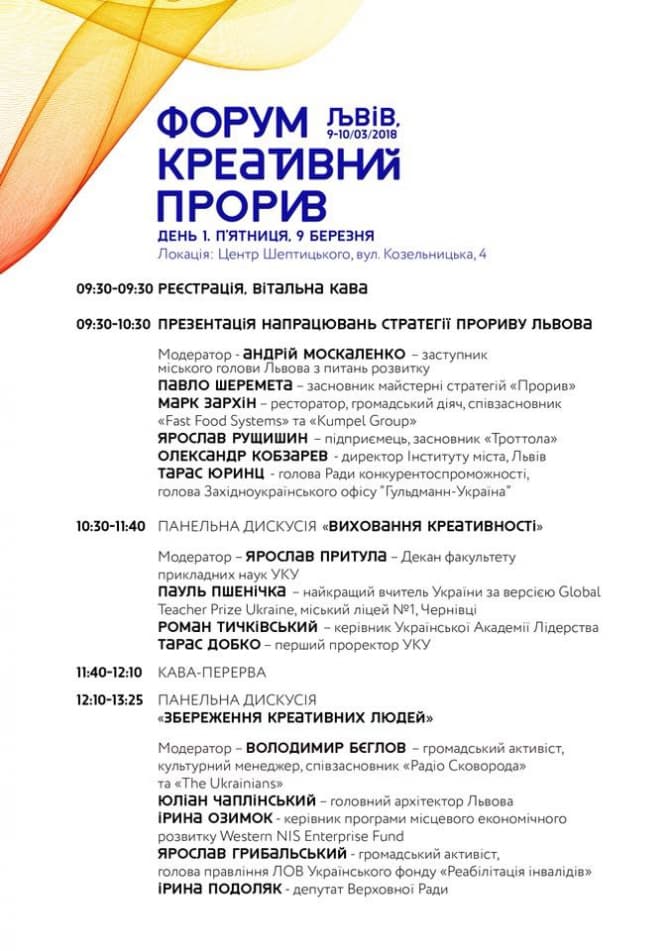 9 та 10 березня у Львові відбудеться форум «Креативний прорив», який об’єднає креативних людей із усієї країни, задля творення «Міста 3.0» – моделі креативного, соціально відповідального партисипативного міста.