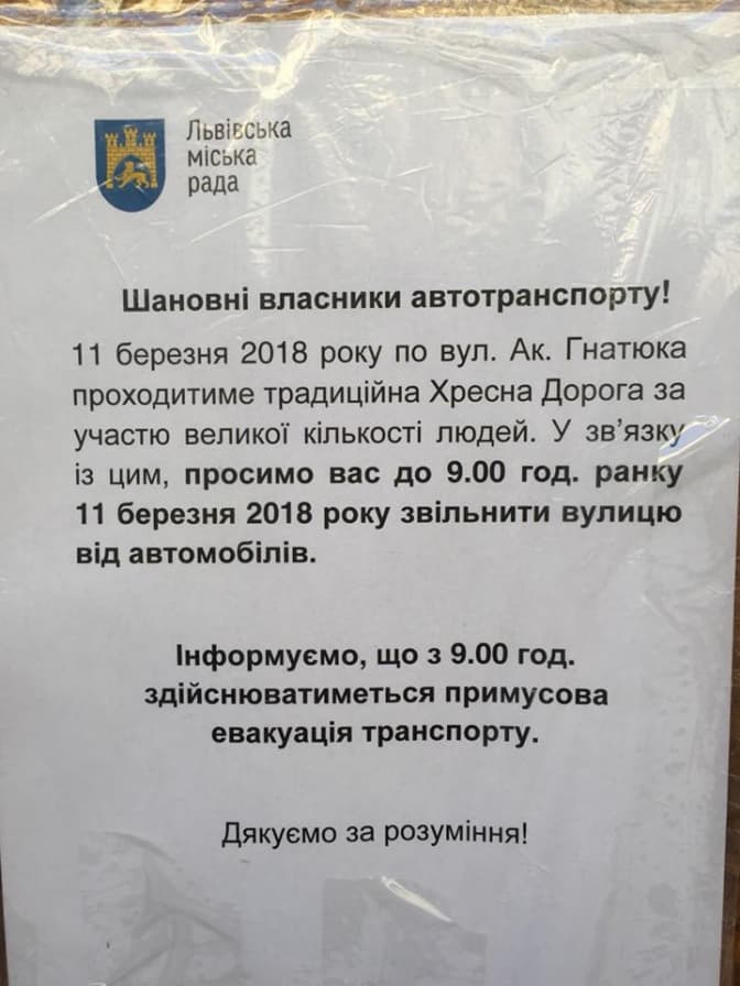 У зв'язку з Хресною ходою, яка сьогодні, 11 березня, пройде Львовом, міська рада заборонила паркуватися на вулиці Гнатюка. Оголошення з проханням звільнити вулицю від автотранспорту опублікував Lviv.com на своїй сторінці у Facebook. У повідомленні йдеться, що припарковані авто будуть евакуйовуватися.