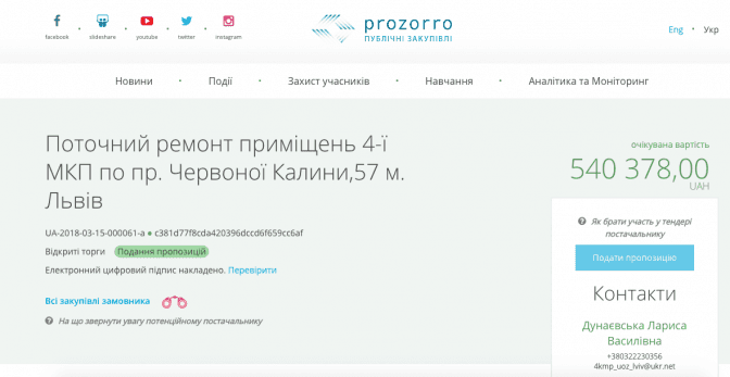 Кінцевий строк подання тендерних пропозицій встановлено на 30 березня 2018 року. Аукціон щодо визначення виконавця робіт має розпочатися 2 квітня. Виконавці мають закінчити ремонт поліклініки до 31 травня 2018 року.
