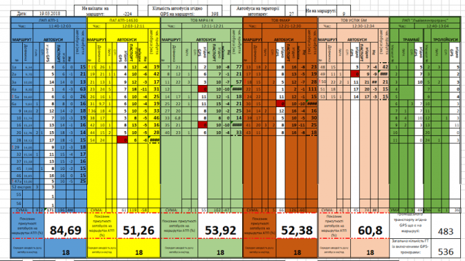 В період з 11:40 до 13:04 на маршрути у Львові виїхали 398 автобусів, не виїхали 224, що становить 36% від загальної кількості. Про це інформує ГО «За якісний транспорт» з посиланням на дані GPS-трекерів на офіційному сайті ЛМР.