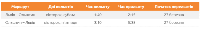 Польський авіаперевізник LOT виконуватиме рейси щовівторка та щосуботи зі Львова, а у зворотному напрямку з Ольштина — щовівторка та п’ятниці. Час польоту — півтори години. Квитки у два боки на економ-клас коштують від 54 євро.