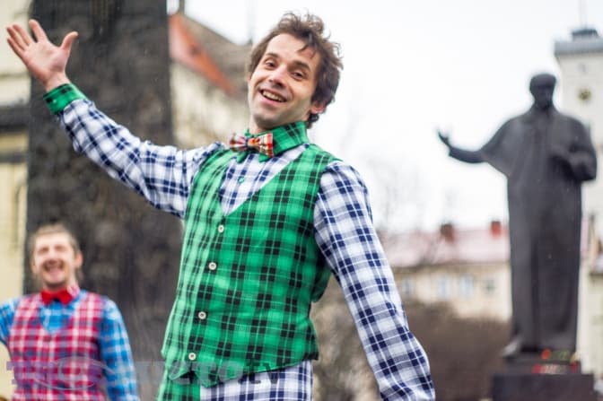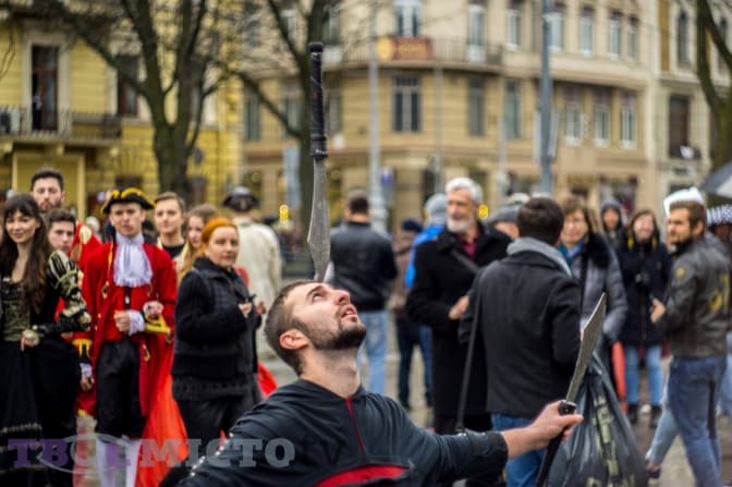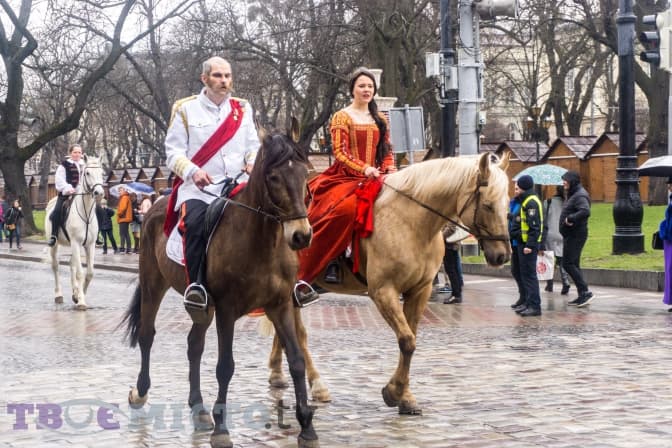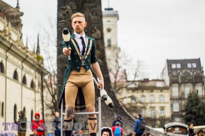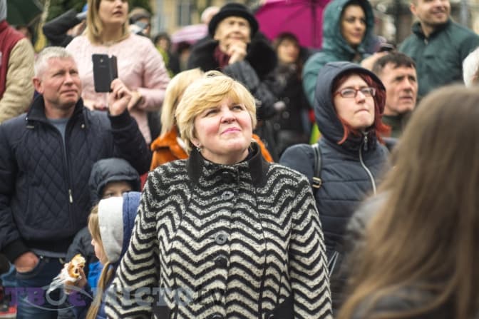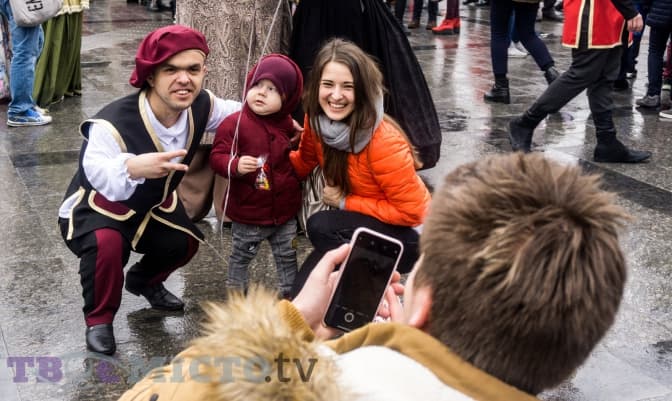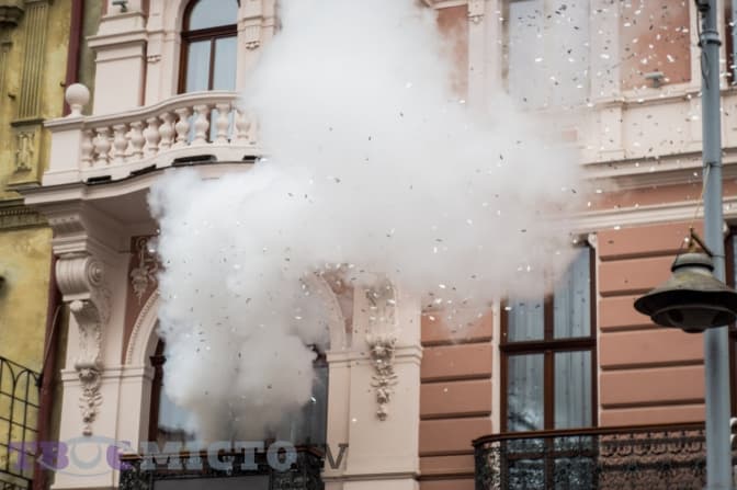 У цей час з другого поверху готелю випускають срібну мішуру, а на площі біля пам’ятника Тарасові Шевченку свій виступ починають акробати у яскравих костюмах. Попри дощ, вони старанно виконують трюки. Люди захоплено аплодують, створивши неначе ритуальне коло навколо них. Помітно, що не всі достеменно розуміють, чому приурочене це дійство.