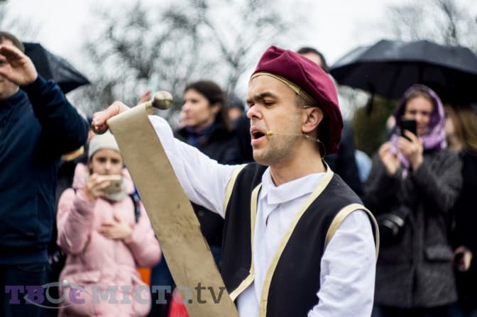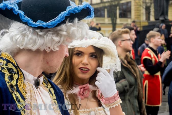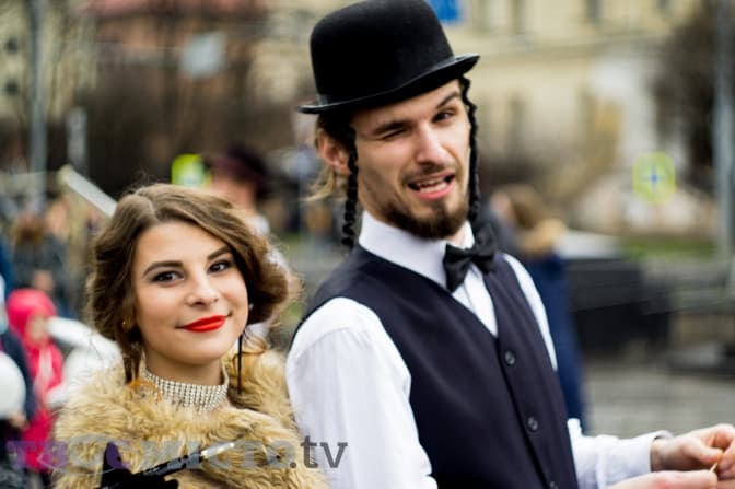 — А буде ваша зіронька, щоб стрічку перерізати? — запитує дівчина в учасниці театралізованої постановки. Та знизує плечима, опускає очі і йде роздавати солодощі перехожим.