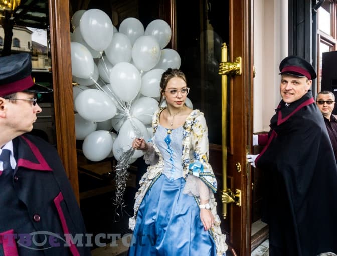 Людям починають роздавати кульки та солодощі. Усі охоче беруть і роблять фотографії з парами акторів у ролі аристократів. За декілька хвилин площа стає білою хмарою — кожен має в руці білу кульку з логотипом «Гранд готелю».