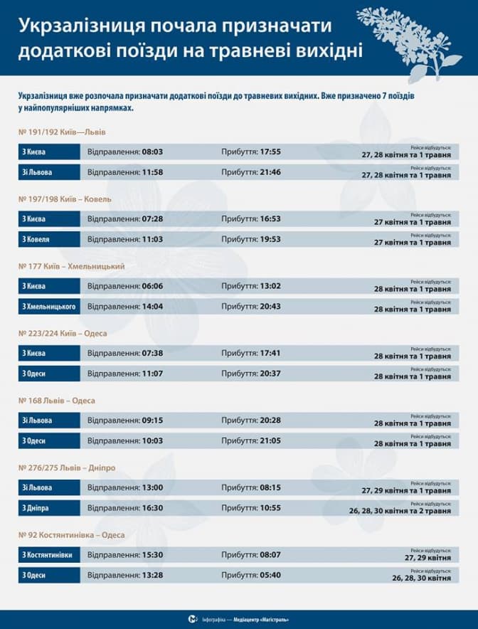 Перелік додаткових потягів через Львів на травневі свята