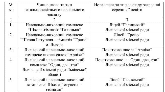 Зокрема йдеться про зміну назви й типу таких навчальних закладів Львова: