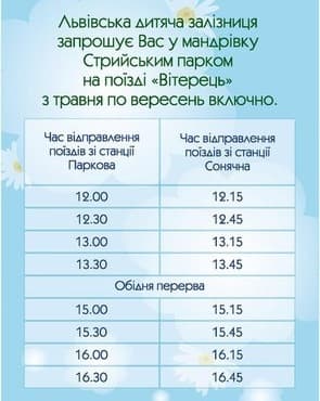 Працюватиме дитячий потяг «Вітерець» буде до вересня включно. У літні місяці рух здійснюється по середах, суботах, неділях та святкових днях. У травні та вересні – лише по неділях та святкових днях.