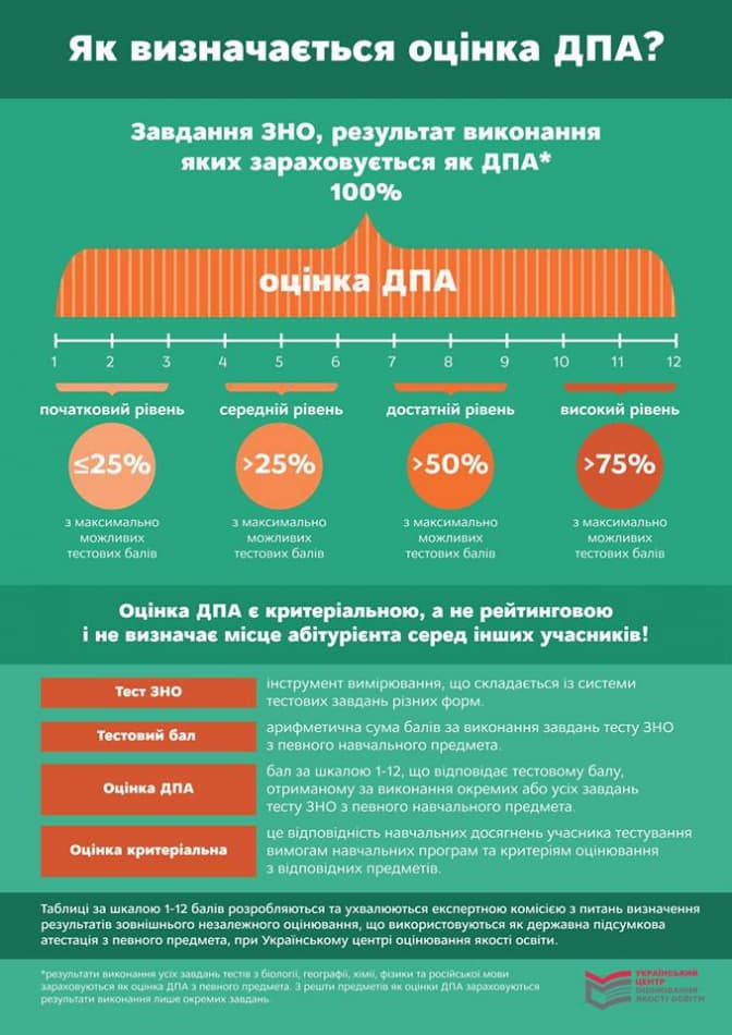 Для випускників загальноосвітніх навчальних закладів результати ЗНО з трьох предметів зараховуватимуть як оцінки за ДПА за шкалою 1–12 балів. Першим обов’язковим предметом ДПА є українська мова і література. Другим — за вибором випускника: математика або історія України (період ХХ — початок ХХІ століття). Третій предмет випускники обирають самостійно із запропонованого вище переліку.