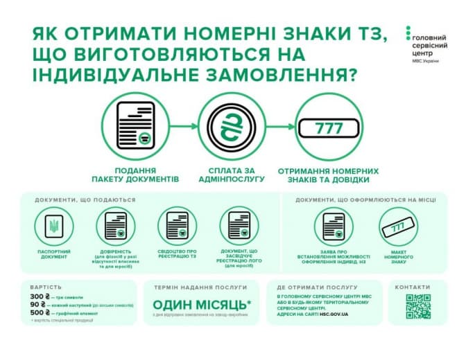Знак виготовлятимуть упродовж місяця з дня замовлення, після необхідно з’явитись до Головного сервісного центру МВС і отримати індивідуальний номерний знак та довідку, на підставі якої в подальшому зареєструвати цей знак за відповідним транспортним засобом.