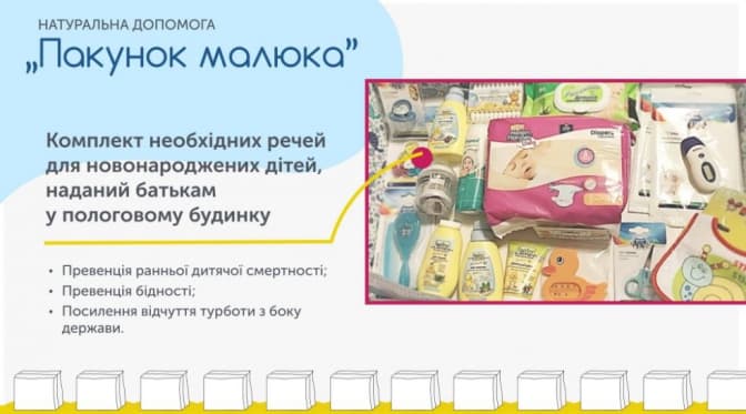 «У світі називають "бейбі-бокс", у нас це буде "пакунок малюка". Він буде додатково до грошових виплат при народженні дитини. Це і превенція ранньої дитячої смертності, і попередження бідності», — зазначила заступниця міністра соціальної політики Олександра Чуркіна.