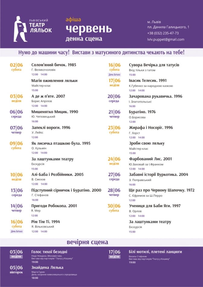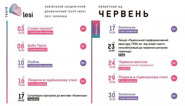 Львівський національний академічний театр опери та балету імені Соломії Крушельницької у червні пропонує своїм глядачам такі вистави: