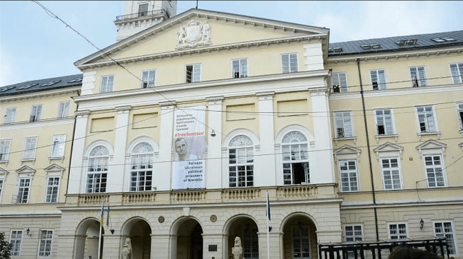 Від сьогодні, 4 червня, на фасаді Ратуші висітиме банер на підтримку українських політичних в’язнів Кремля із хештегом #freeSentsov та написом «Звільнити українських політичних в’язнів Кремля!». Розмір банера – 2,85 м х 7,20 м.