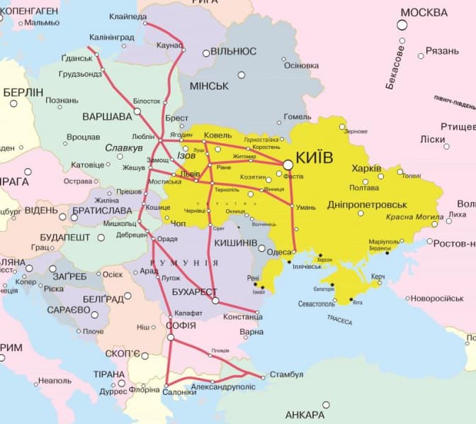 В Україні магістраль проходитиме через Львів, Мостиська, Тернопіль, Чернівці, Луцьк, Ягодин, Рівне, Житомир, Вінницю, Коростень, Умань, Одесу, Київ.