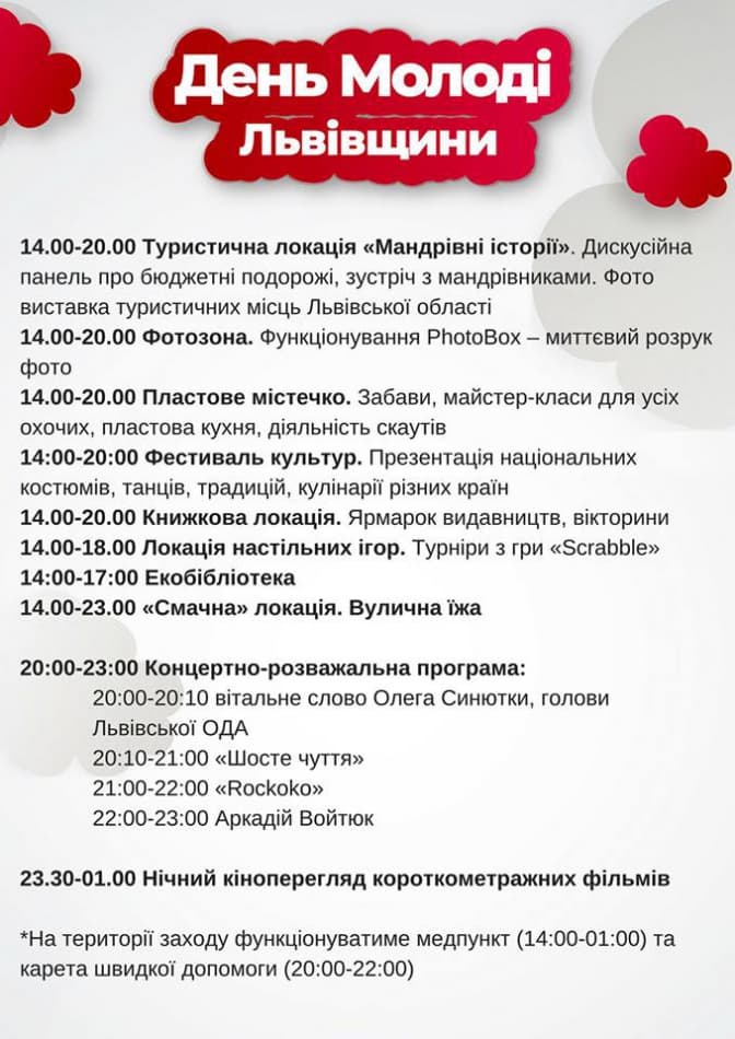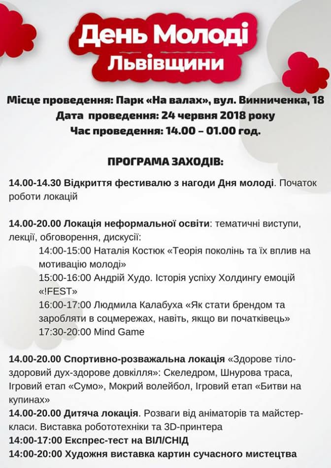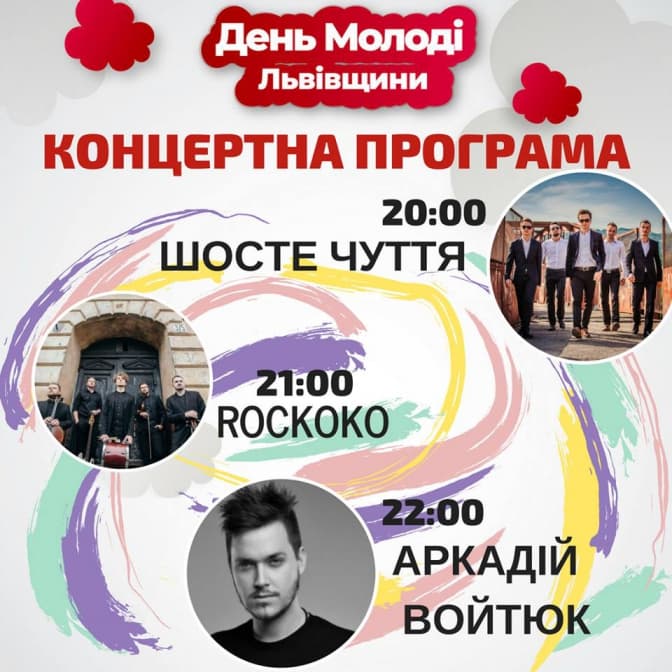 Сьогодні, 24 червня. у Львові відсвяткують День молоді. Урочистості розпочнуться о 14:00 у парку «На валах» (сквер напроти Львівської ОДА, вул. Винниченка, 18) і триватимуть до 01:00. Музичними хедлайнерами свята стануть український виконавець Аркадій Войтюк та гурт «Шосте чуття».