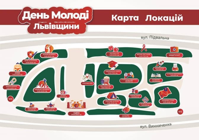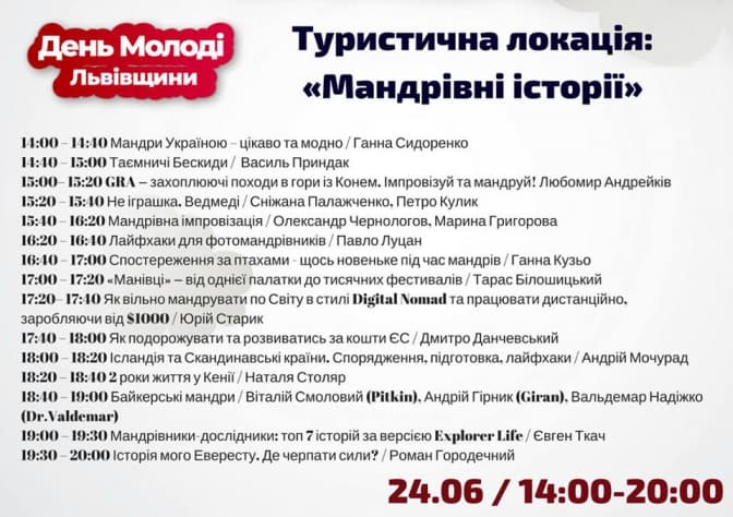 У програмі заходів, які відбуватимуться впродовж дня, запланували мокрий волейбол, концерти, майстер-класи, кіно просто неба, фотобокс, дитяче містечко, битву на купинах, розіграш подарунків, серед яких подорожі в Будапешт та Відень, робототехніку та 3D-друк, мандрівні історії, фестиваль культур, еко-бібліотеку, надувний скеледром, пластове містечко та інтелектуально-розважальну гру «Mind Game».