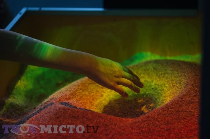 Один із таких стендів – це інтерактивна пісочниця, в якій, окрім кварцового піску, є проектор. Інтерактивна ж вона тому, що спрямована на взаємодію з дитиною. Пісочницю можна запрограмувати на різні завдання. Наприклад, дитина може зробити сама гори та море. Чим глибшу яму вона викопує руками, тим синішого кольору вона стає. Натомість чим вищу гору дитина будує, тим білішою буде її верхівка, адже це означає наявність снігу на ній. Вікторія Круглова розповіла, що це найдорожча наукова атракція серед усіх приладів, які вони мають.