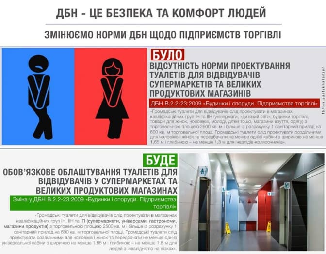 Відтак в кожному супермаркеті, гіпермаркеті, гастрономі та великих продуктових магазинах мають запроектувати один санітарний прилад на 600 кв. м та не менше однієї універсальної кабіни для людей з інвалідністю.