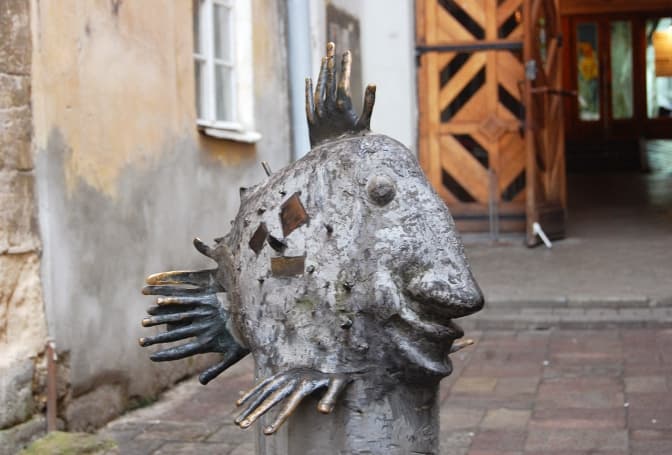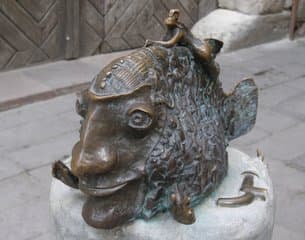 Перед входом, на літнику гостей зустрічає пам’ятник усмішці. Усміхнену рибу з людськими долонями замість плавців придумав карикатурист Олег Дергачов. Пам’ятник обіцяли змінювати на новий кожні сім років. Вперше його встановили у 2001, потім у 2008 на нову «Усмішку», набагато щирішу і більшу у розмірах.