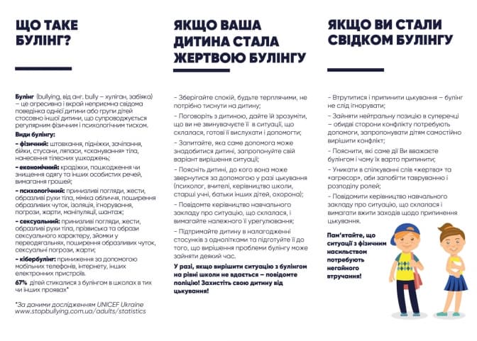 Додамо, що за даними дослідження UNICEF за 2017 рік, в Україні 67% дітей стикалися з булінгом (були жертвою або свідком), а 40% постраждалих від цькування взагалі ні з ким не ділилися проблемою і не зверталися за допомогою. 25% – говорили про це не з дорослими. З тих, хто мовчать – 40% соромляться про це говорити, а 22% вважають, що це нормальне явище.