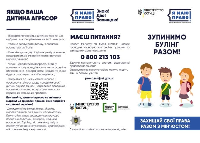 Зокрема, у межах кампанії, у Мін’юсті розробили інформаційні матеріали про види булінгу та як діяти у ситуації, якщо ви стали свідком булінгу. Крім цього, у них є інформація для батьків, чиї діти стали жертвами цькування або насильства.