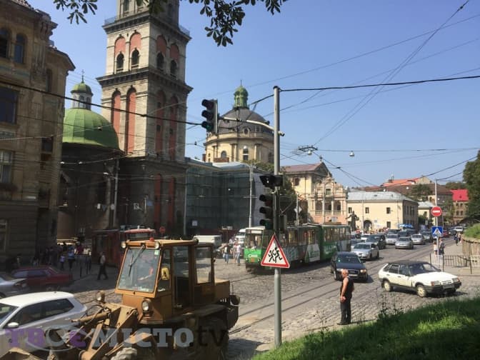 У протилежному напрямку від площі Ринок трамваї курсують, втім по Підвальній зупинилися й трамваї №7, утворюється затор із автомобілів.