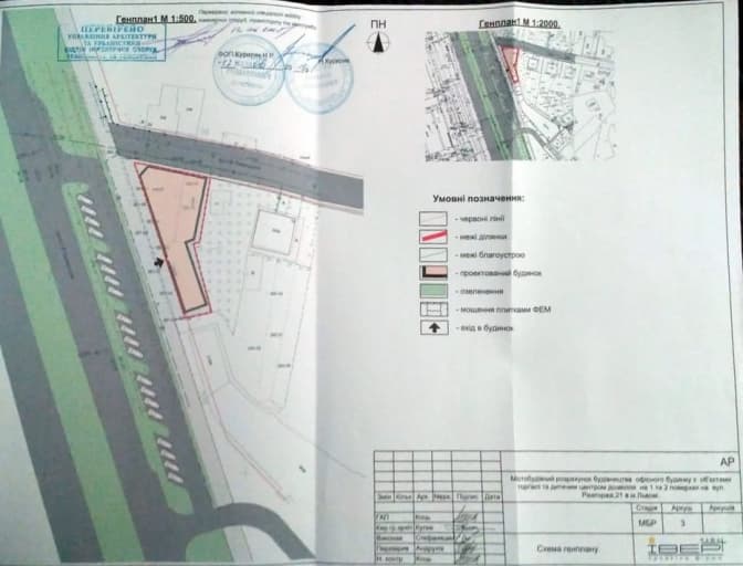 Крім офісів, у будівлі запроектували торгові приміщення та дитячий центр дозвілля на першому та другому поверхах. Від наявних будинків поблизу нового будівництва має бути відстань не менше 10 м з одного боку та 6 м з іншого.