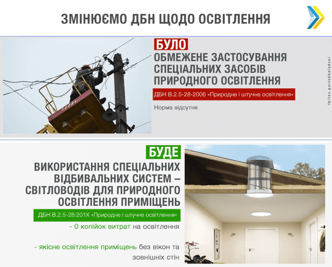 У Міністерстві регіонального розвитку та будівництва хочуть ввести нові державні будівельні норми, які передбачають можливість використання спеціальних відбивальних систем – світловодів для природнього освітлення приміщення. Про це у себе на Facebook повідомив заступник міністра регіонального розвитку та будівництва Лев Парцхаладзе.