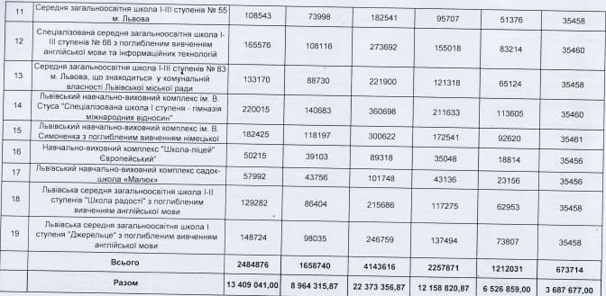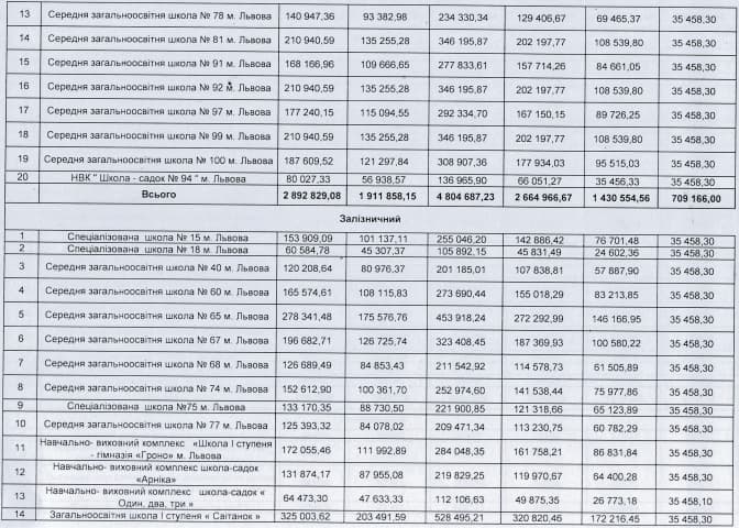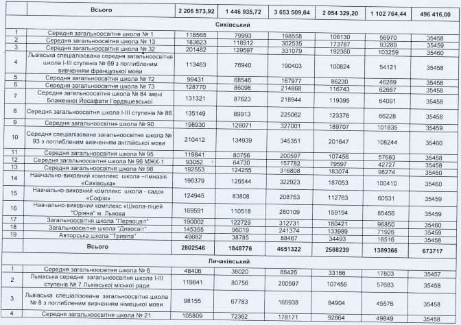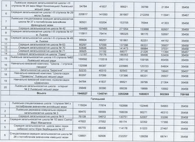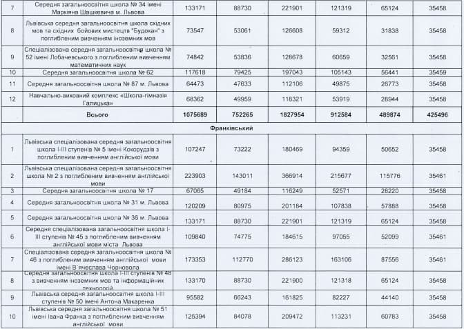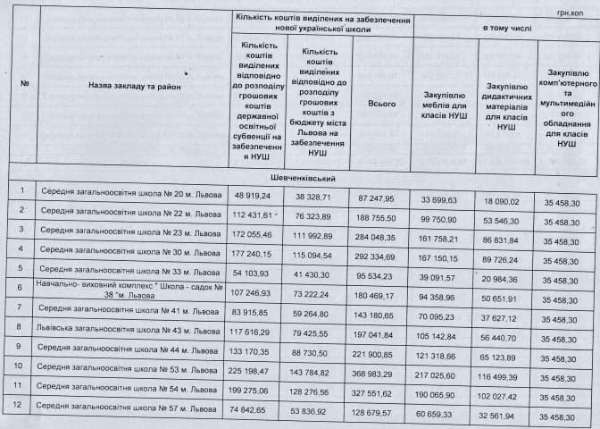 Таблиця розподілу коштів на потреби НУШ між львівськими школами наведена нижче.