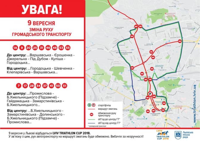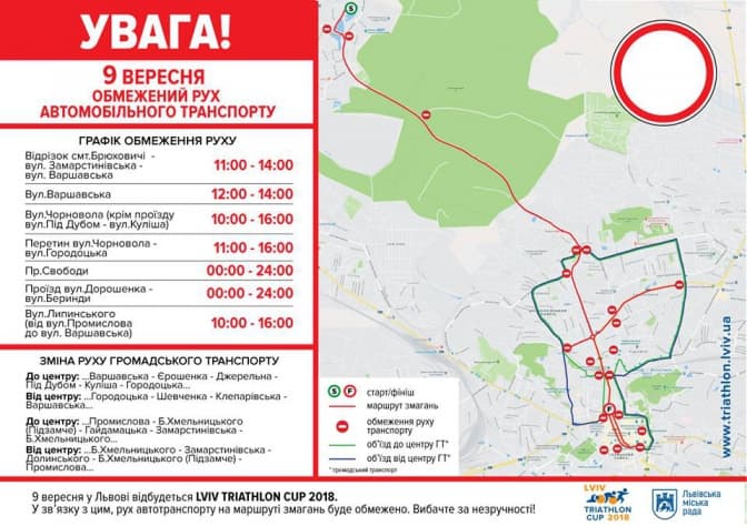 9 вересня у Львові відбудуться міжнародні змагання «Lviv Triathlon Cup». У зв'язку з цим, рух автотранспорту на маршруті змагань буде обмежено, передає Гаряча лінія міста.