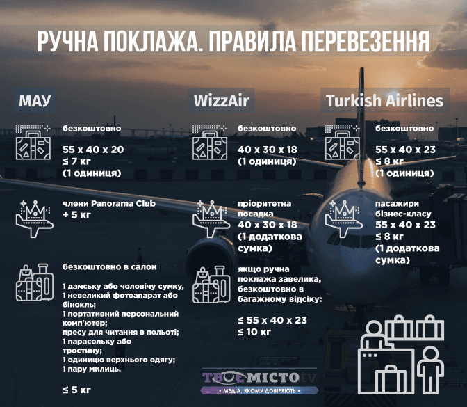 Під час реєстрації або посадки, у випадку нестачі місць, ручну поклажу можуть розмістити у багажному відділенні літака без додаткової платні.