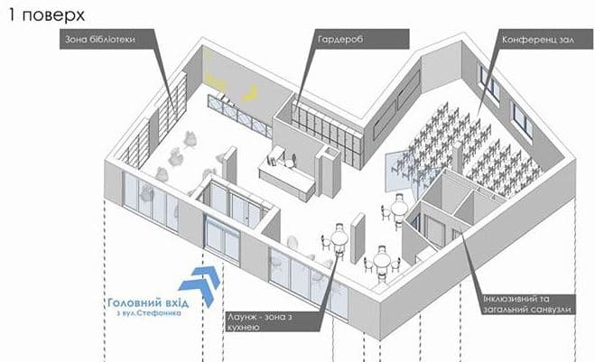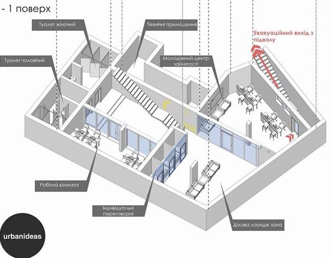 Проект розробили ГО Urbaniseas, за яким на площі 300 кв. м облаштують два поверхи. На першому розмістять бібліотеку, конференц-зал та лаундж-зону з кухнею, а також гардероб та інклюзивний санвузол. На мінус першому поверсі має з’явитись молодіжний центр зайнятості, робоча кімната, індивідуальні переговорні, ділова лаундж-зона та технічні приміщення.
