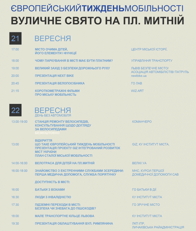 У межах Європейського тижня мобільності у Львові, на площі Митній упродовж 21 та 22 вересня відбудеться вуличне свято, повідомляють організатори.