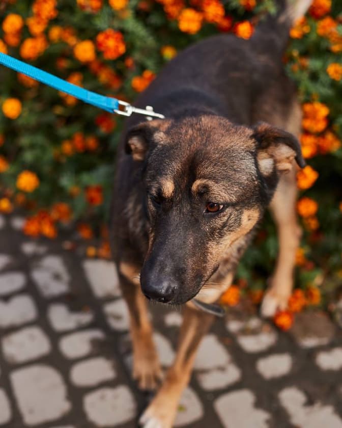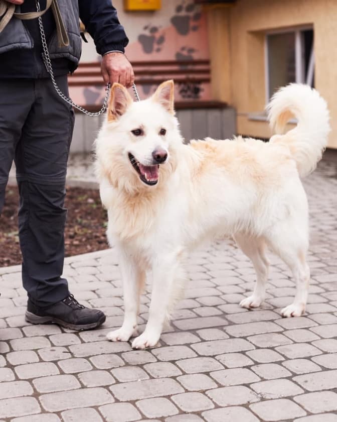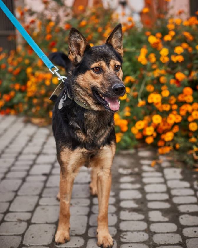 Шері, метис вівчарки. Молода, наразі трішки налякана, можливо, загубилась. Мала на собі нашийник.