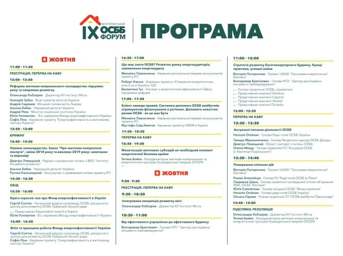 4 та 5 жовтня у Львові відбудеться Всеукраїнський форум об'єднань співвласників багатоквартирних будинків (ОСББ). Участь у цьогорічному Форумі візьме 230 представників успішних ОСББ та Асоціацій ОСББ з усієї України. Учасниками панельних дискусій будуть представники влади Львова, очільники відділів та управлінь житлового господарства обласних центрів, представники Міністерства регіонального розвитку, будівництва та житлово-комунального господарства України, міжнародних організацій та громадського сектору.