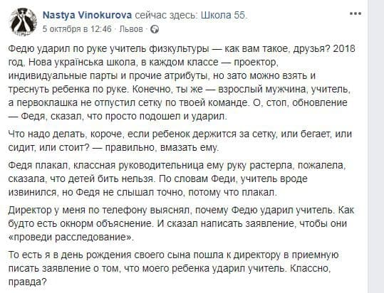 У суботу, 6 жовтня, низка львівських ЗМІ повідомили про побиття у школі №55 учня, яке набуло значного резонансу. У своїх матеріалах вони посилались на пост його матері Анастасії Винокурової у Facebook.