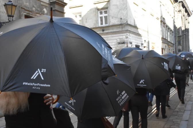 Учасники акції пройшли за маршрутом від вул. Університетської,1 до скверу «На валах» (вул. Винниченка). Всі вони були вбрані в темний одяг і мали чорні парасольки з надписом «WalkForFreedom» та наліпками «Проти ДІЙ торгівлі людьми».