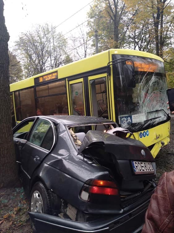 За словами водія автобуса, автомобіль їхав на великій швидкості. Водій автобуса зупинився, оскільки бачив, що авто виїхало на зустрічну смугу. Потім воно в'їхало в автобус, а далі — у дерево. З фото видно, що унаслідок аварії в автобуса вщент розбите скло та пошкоджений бампер.
