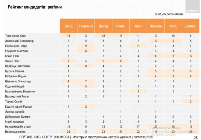 Загалом по Україні серед кандидатів на президентське крісло також лідирує Юлія Тимошенко, яку готові підтримати 21% опитаних, які будуть голосувати. На другому місці в загальноукраїнському рейтингу – Володимир Зеленський з 11%, на третьому – Петро Порошенко і його 10%. Також 10% підтримки має Анатолій Гриценко. Далі йдуть Юрій Бойко, Олег Ляшко, Святослав Вакарчук та Євген Мураєв з рейтингом, 9, 8, 6 та 5% відповідно. Соціологи зазначають, що Володимир Зеленський обігнав Святослава Вакарчука лише за останні півроку.