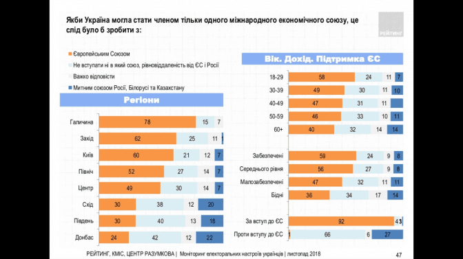 Також мешканці Галичини відповідали на питання про те, як би вони проголосували, якби їм довелось зараз думати про вступ в Європейський союз. Так, цю ідею підтримує 81% опитаних, проти – 8%, а 4 і 7% відповідно не будуть голосувати взагалі або не визначились. Жоден з опитаних галичан не бачить майбутнього України в Митному союзі з Росією, натомість 78% підтримують економічну співпрацю з ЄС, 15% вважають, що не потрібно жодних союзів, 7% не змогли відповісти.