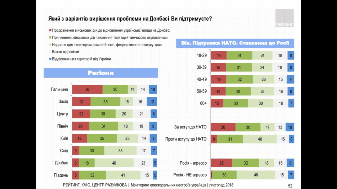 Згідно з даними дослідження, 36% опитаних галичан підтримують продовження військових дій на Сході України, ще 30% вважають, що ці дії потрібно припинити і визнати ці території окупованими, 14% не змогли відповісти на питання про долю Донбасу, 10% згідні на їхнє відділення від території України, а 11% згідні надати Донбасу федеративний статус. Разом з тим, 94% опитаних галичан вважають Росію агресором, а 2% – ні. Решта не змогли відповісти на це запитання.