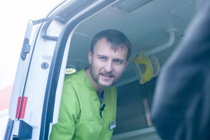 Лікар медицини невідкладних станів Володимир Черкасов показує автомобілі «невідкладної допомоги» — це справжні «швидкі», а не перероблені на санітарні автомобілі: «У нас це справжні реанімобілі, які, відповідно, забезпечені усім, що має бути в реанімобілі».
